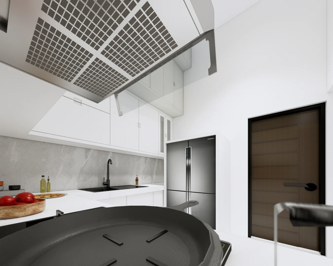 Dapur CD House dibuat praktis dengan konsep modern minimalis. Kitchen set full kabinet warna putih memberikan kapasitas penyimpanan maksimal dan tampilan yang bersih. Sementara elemen perangkat berwarna gelap menjadi aksen visual yang memperkaya desain. Ruang dapur ini memadukan fungsi dan estetika secara seimbang sehingga nyaman digunakan setiap saat