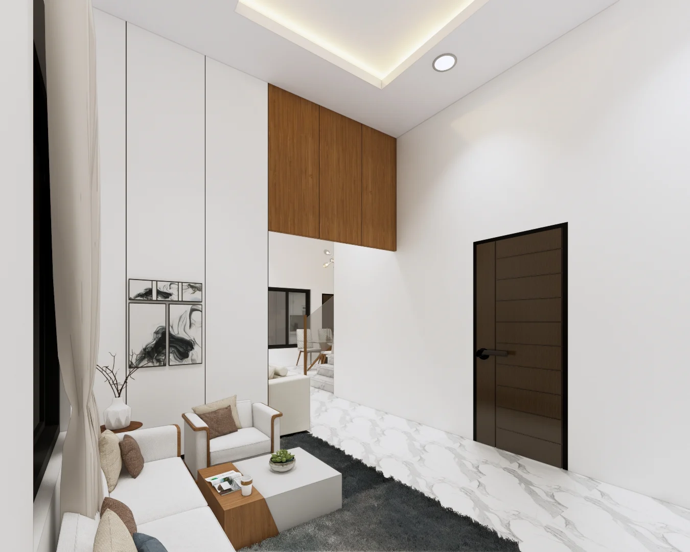 Bagian interior dirancang dengan pendekatan yang sama: terang, rapi, dan fungsional. Ruang tamu didominasi warna putih dengan aksen kayu hangat yang membangun suasana nyaman serta membuat ruangan terasa lebih lapang. Pemasangan curtain panjang menambah kesan mewah sekaligus memberikan kontrol cahaya yang optimal. Semua elemen disusun dengan mempertimbangkan kenyamanan keluarga dalam beraktivitas sehari-hari.