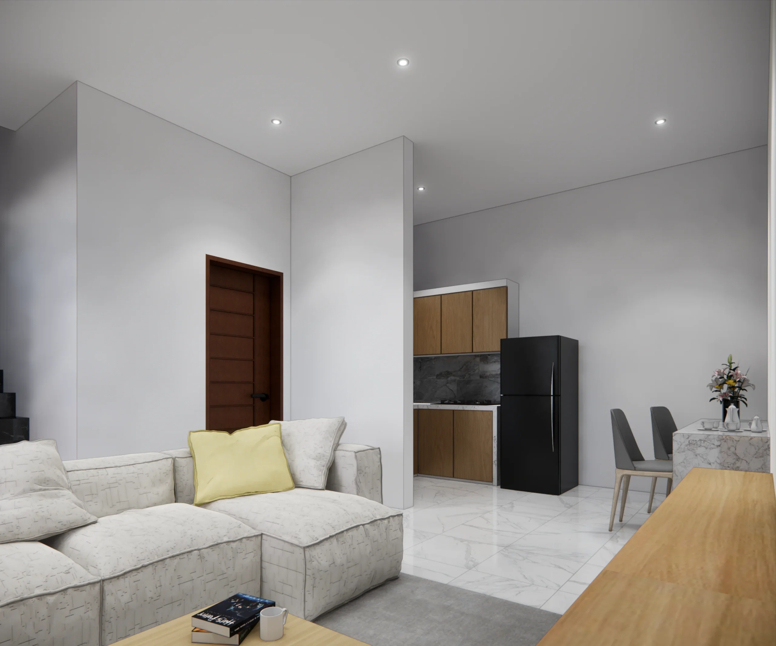 Masuk ke area interior, HDC House mengusung konsep modern minimalis yang menonjolkan kesederhanaan, kenyamanan, dan fungsionalitas. Ruang keluarga ditata dengan material bernuansa lembut serta pencahayaan LED yang memberi efek hangat dan elegan.