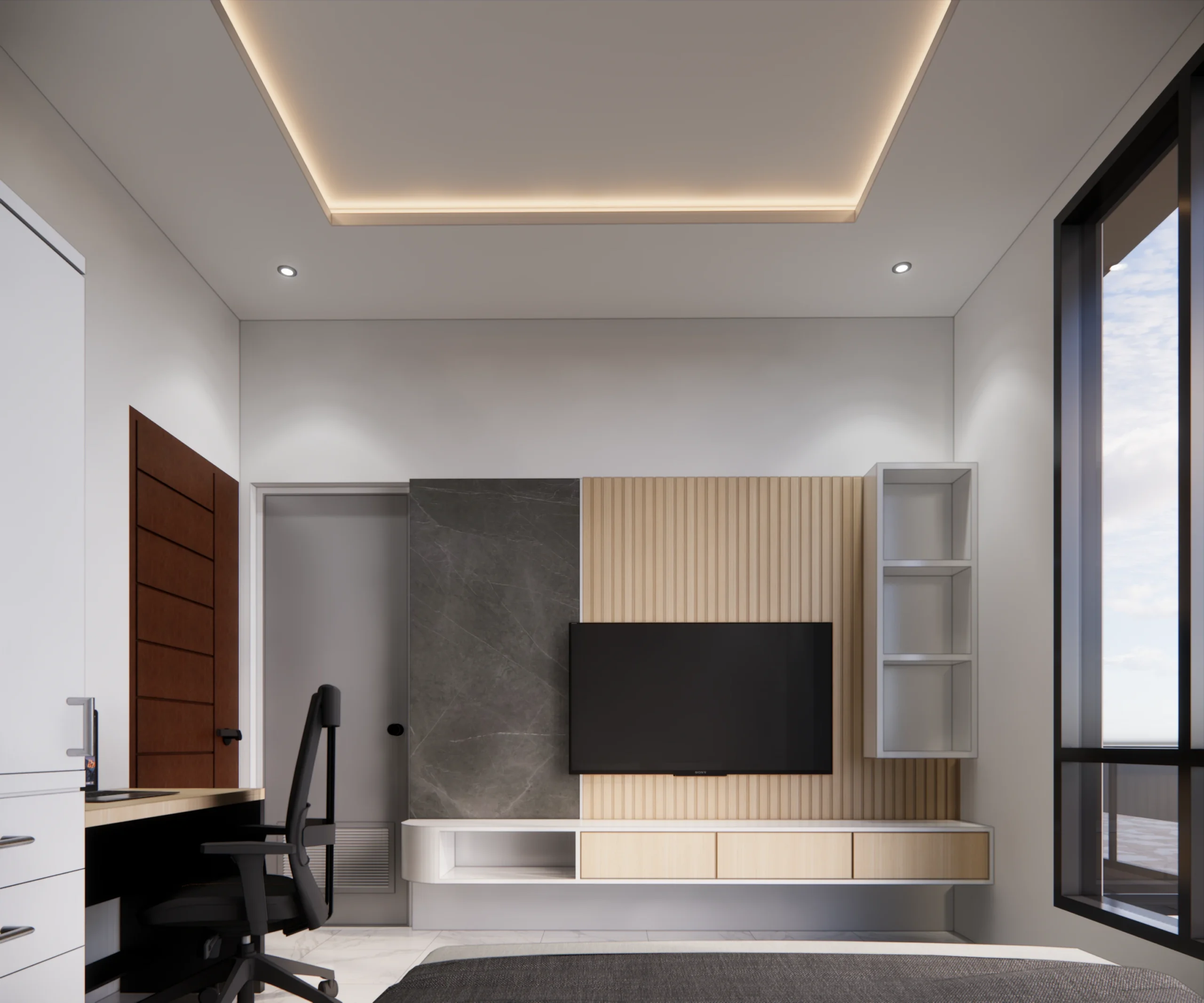 Fasad rumah menonjolkan perpaduan warna putih dan abu netral dengan aksen panel kayu vertikal, menciptakan komposisi visual yang tegas sekaligus hangat. Kesan modern diperkuat dengan bentuk geometris yang proporsional serta elemen kaca lebar yang menghadirkan pencahayaan alami ke dalam ruangan.