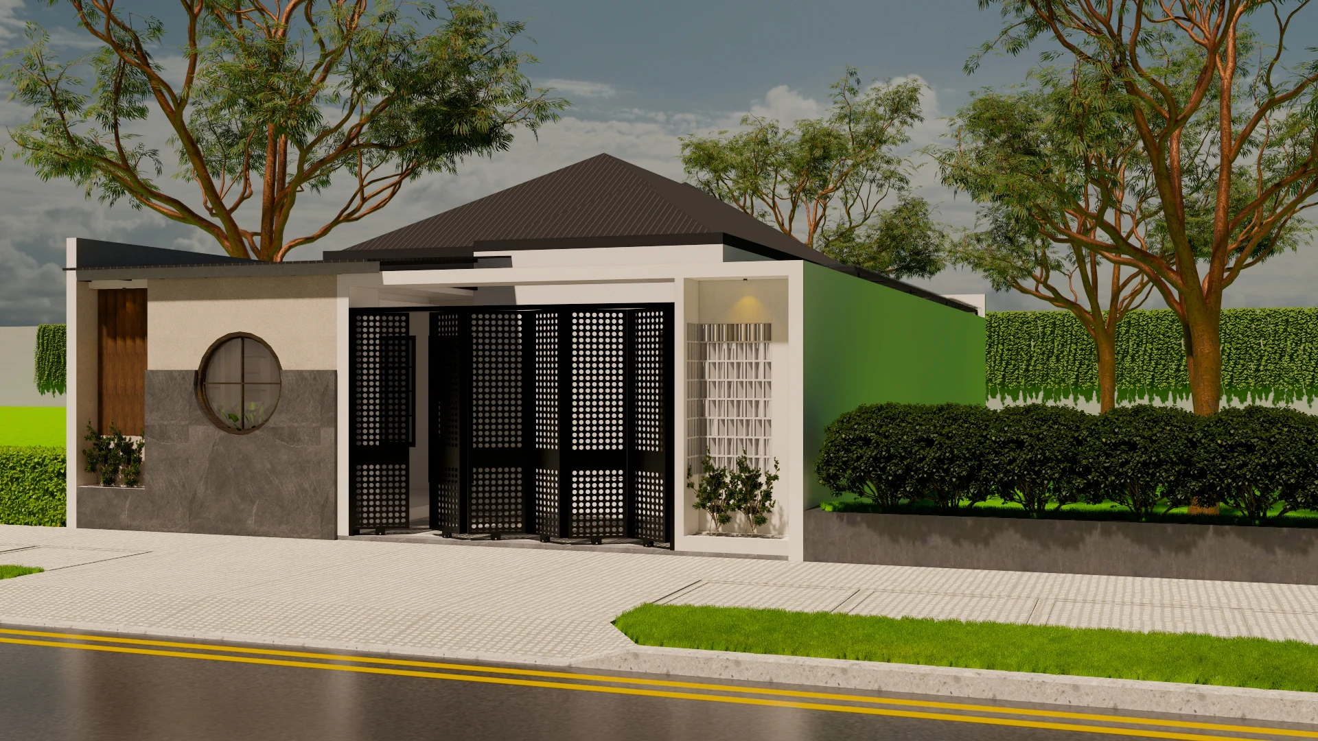 Fasad bangunan menampilkan karakter unik dengan perpaduan kisi hitam modern dan bentuk jendela bulat yang menjadi focal point desain. Kombinasi warna netral seperti putih, abu-abu, dan hitam memberi kesan elegan, sementara elemen kayu dan pencahayaan eksterior menambah nuansa hangat dan natural.