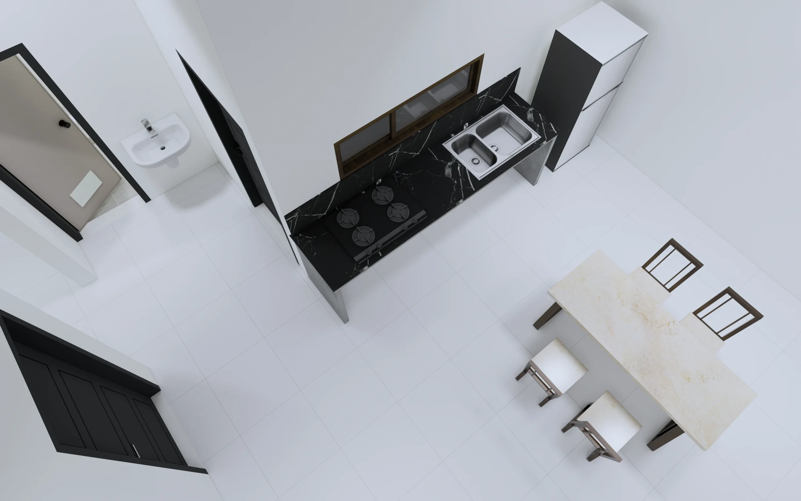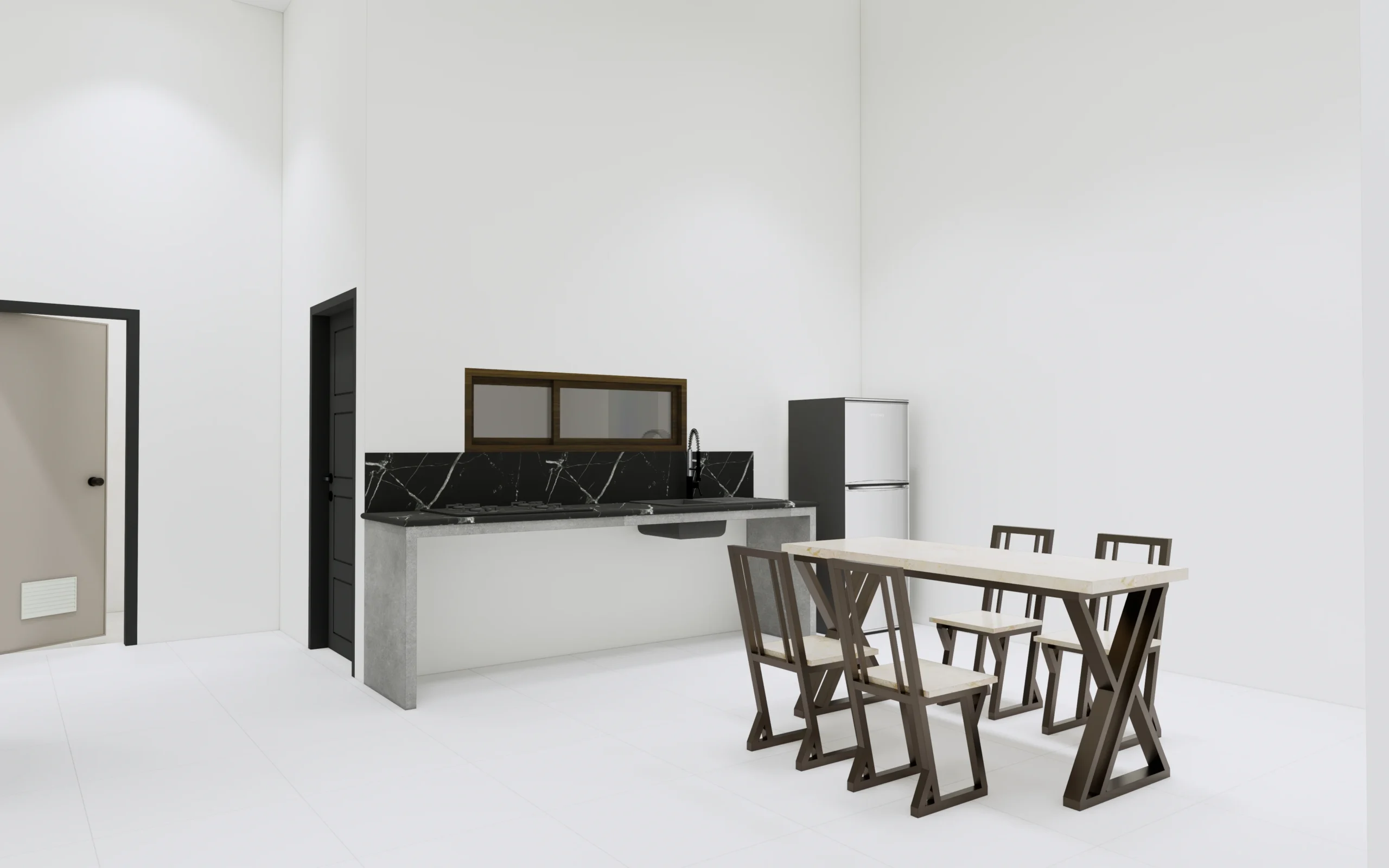 Ruang dapur dan makan mengusung gaya sederhana namun modern, dengan sentuhan material granit hitam pada kitchen set yang memberi kontras elegan terhadap dinding putih bersih.