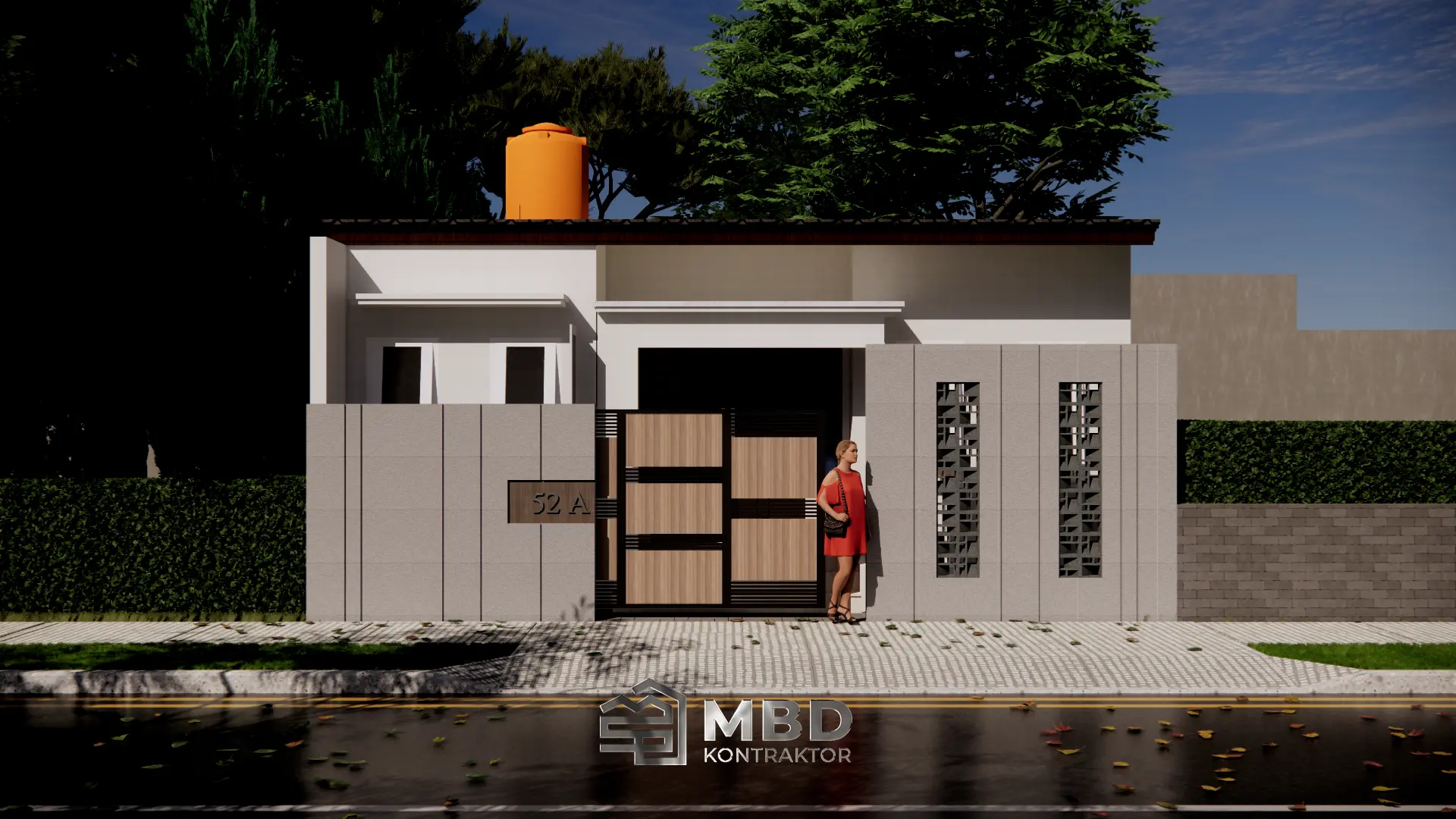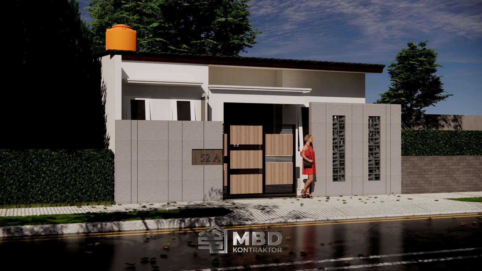 Pintu utama dibuat menyatu dengan pagar, memberikan kesan seamless dan rapi, sementara nomor rumah ditonjolkan secara jelas untuk memudahkan identifikasi. Di bagian atas, tangki air berwarna oranye menjadi aksen fungsional yang kontras namun tetap proporsional terhadap keseluruhan bangunan.