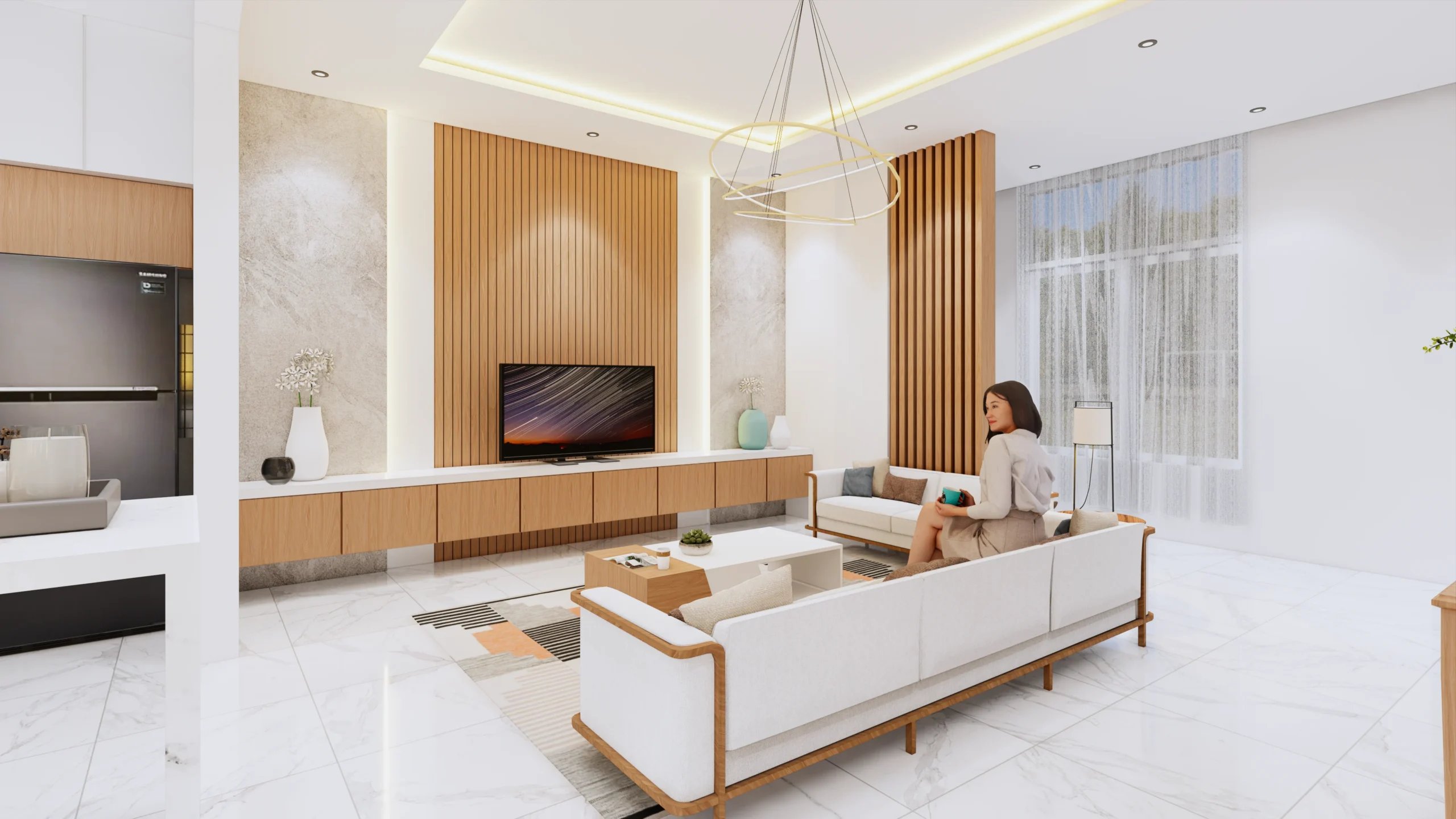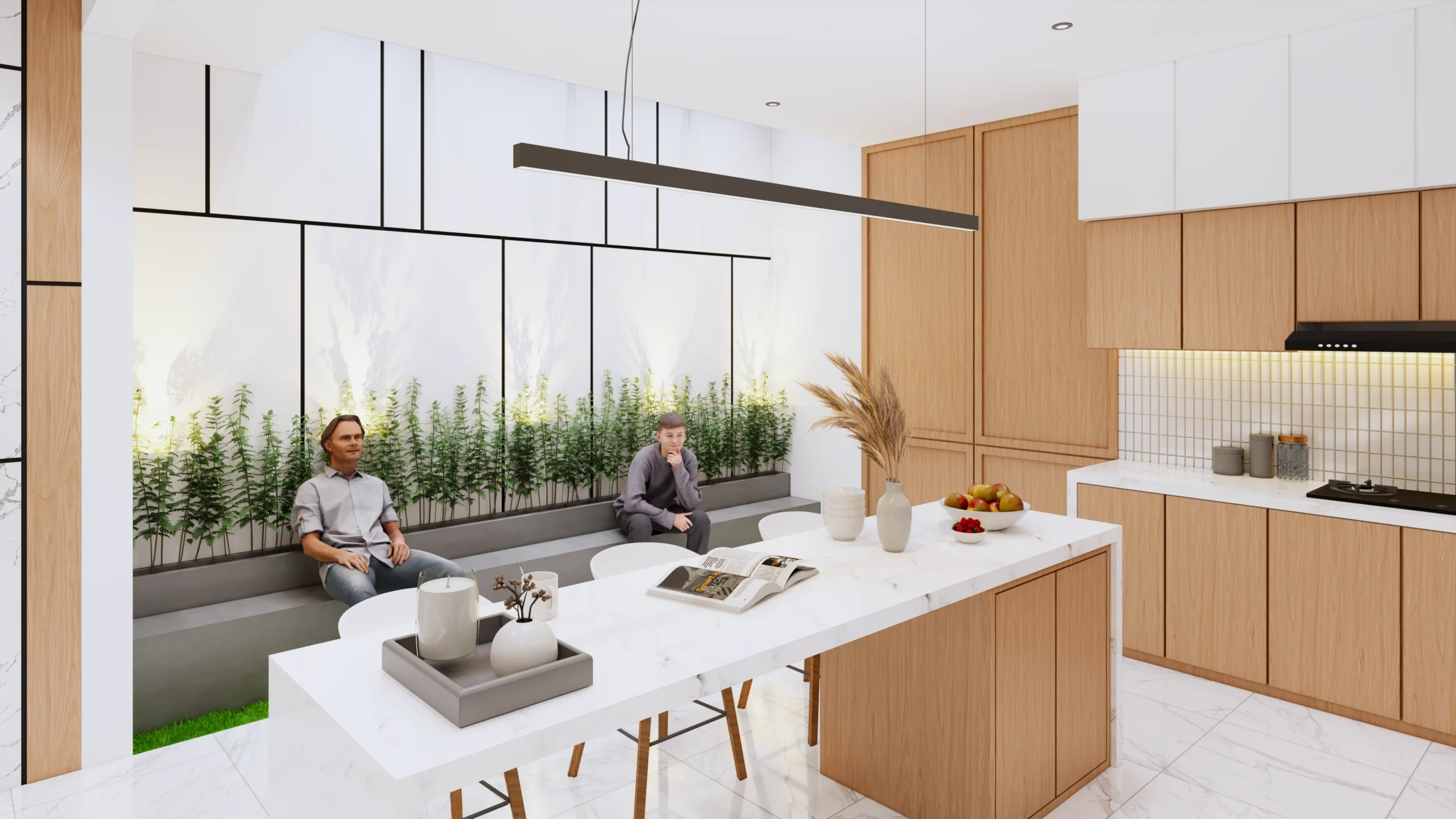 Dominasi warna putih dan kayu alami menjadi ciri khas utama yang memberikan kesan bersih, luas, dan elegan. Sentuhan marble pada lantai serta top table menambah nuansa mewah tanpa meninggalkan kesederhanaan modern. Pencahayaan hangat yang menyusuri langit-langit menambah dimensi ruang yang menenangkan dan nyaman.