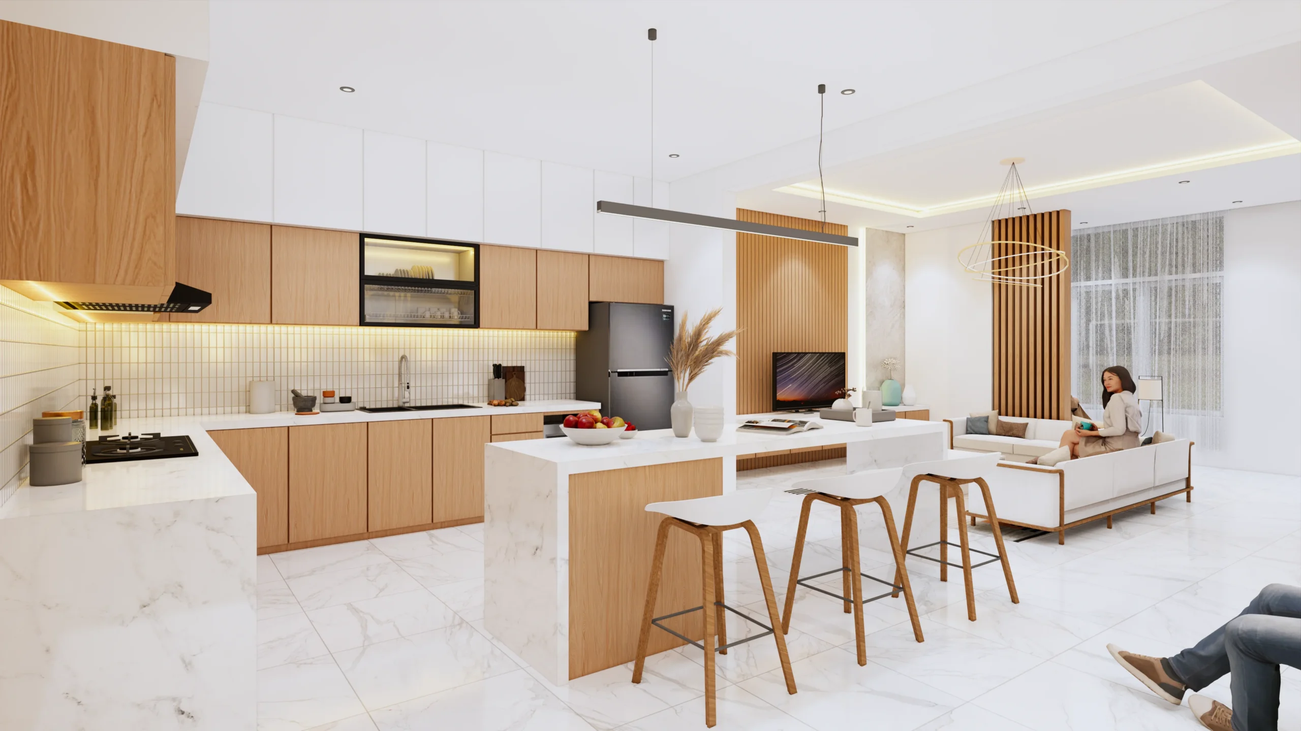 Ruang keluarga menyatu secara harmonis dengan dapur, menciptakan interaksi yang lebih akrab antara anggota keluarga. Penggunaan pencahayaan alami dari jendela besar menjadikan ruang terasa lebih hidup dan segar.